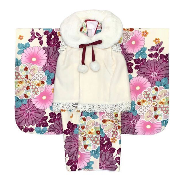 七五三 着物 3歳 女の子用 被布コート&着物5点セット レトロモダンスタイル合繊 白系xベージュ 赤紫菊 TYHFset 3855 01 12