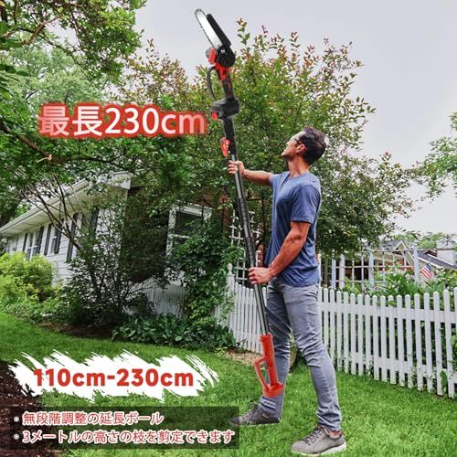 【無段階で調整可能な伸縮ロッド】このチェーンソー高枝は、杆の伸縮範囲が1.1M2.3Mで、脚立不要の安全作業を実現(最大3.5m約の高枝対応)、もう不安定な梯子に立って手鋸で切る必要はありません。自由に長さを切り替えることで、様々な長さの木に対応できます。庭の手入れの様々なニーズに対応します。こんなお悩み解決:屋根より高い枝の処理 脚立の収納場所がない 重い電動ノコギリが苦手 季節ごとの剪定作業効率化