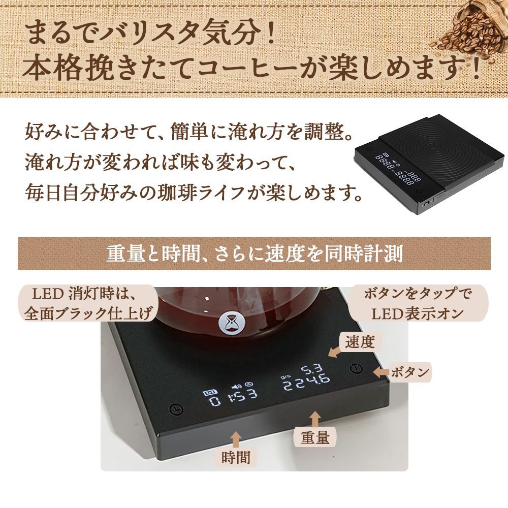流速計測とタイマー機能を搭載し、プロのバリスタのような安定したハンドドリップを実現します。