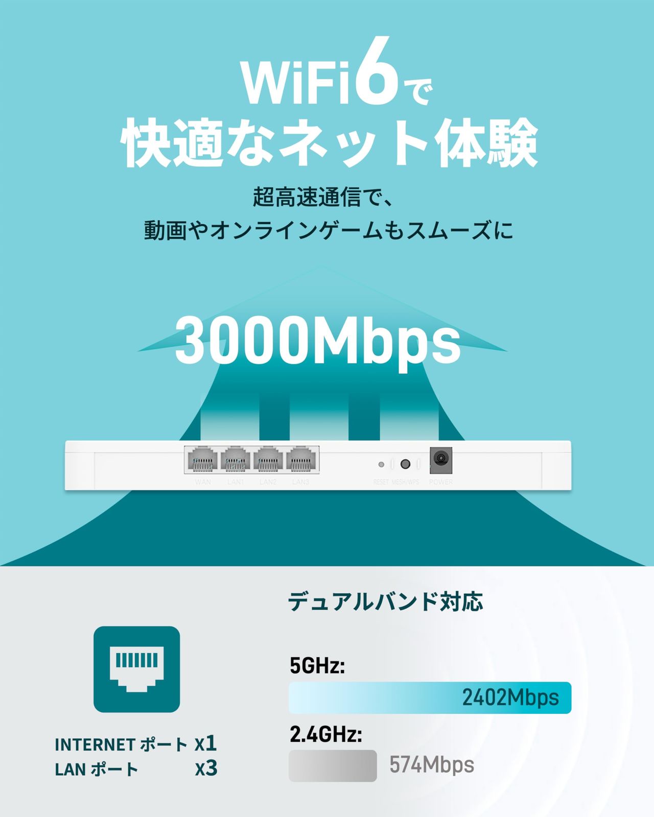【高速通信】Wi-Fi 6対応:5GHz帯で最大2402Mbps、2.4GHz帯で最大574Mbpsの高速通信を実現。ゲームや4Kストリーミング、リモートワークなど、負荷の重い利用環境でも快適なネットワーク体験を提供します。