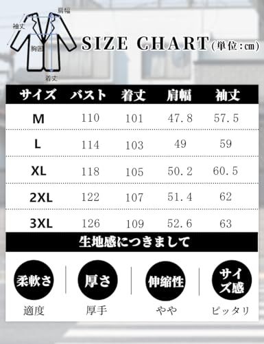 万能のブラック、落ち着いた雰囲気のカーキの2色からお選びいただけます。 サイズ:着丈/胸囲/袖丈/肩幅() 【M】101/110/57.5/47.8 【L】103/114/59/49 【XL】105/118/60.5/50.2 【2XL】107/122/62/51.4 【3XL】109/126/63/52.6 ※寸法は平置きにて計測しておりますので、多少の誤差がある場合がございます。
