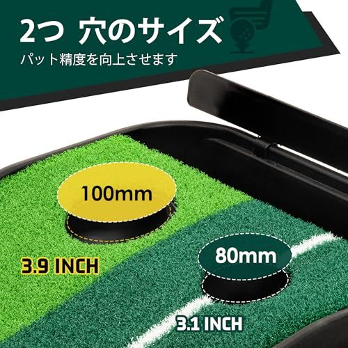 【自動返球機能】こちらのゴルフマットには自動返球機能を搭載しているので反復練習を効率よく行うことができます。カップインもしくは奥のガードまで行ったボールは傾斜を下り排出口から元来た方向へ転がって手元までボールが戻ってきます。