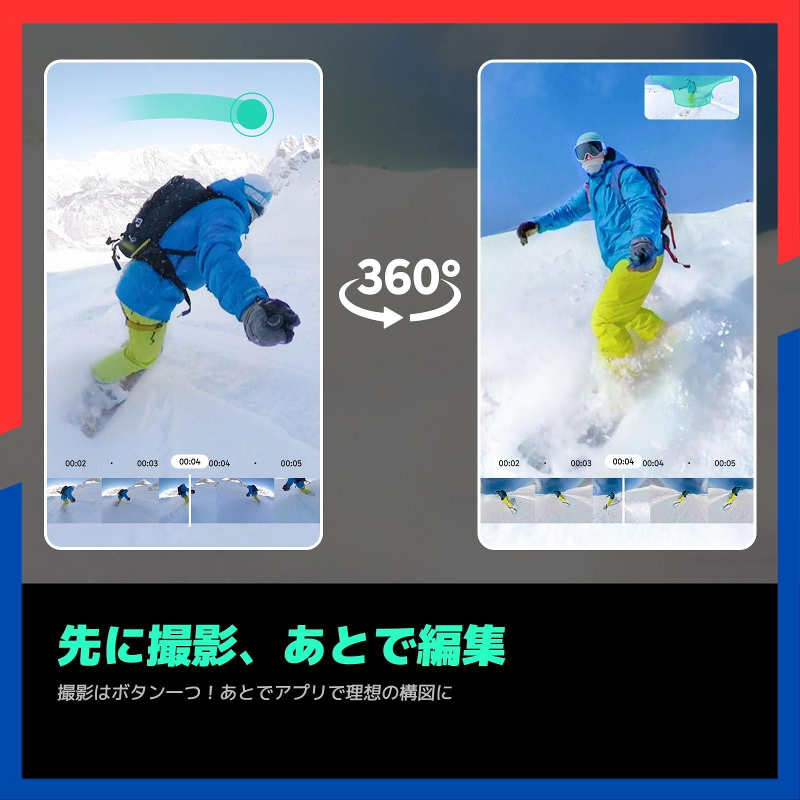 【より明るく、より精細に・72MP 360° 写真】当360度カメラは新型デュアル1/2インチセンサーを搭載して、細部までくっきりとした美しい映像を捉え、アクションを鮮やかに躍動させる。それに、DNG8 RAWフォトモードにより、暗い環境でも画質を向上させ、ダイナミックレンジと編集の自由度を高めます。7200万像素の超高精細写真、圧倒的な解像度で、どんな瞬間もくっきり鮮明に!