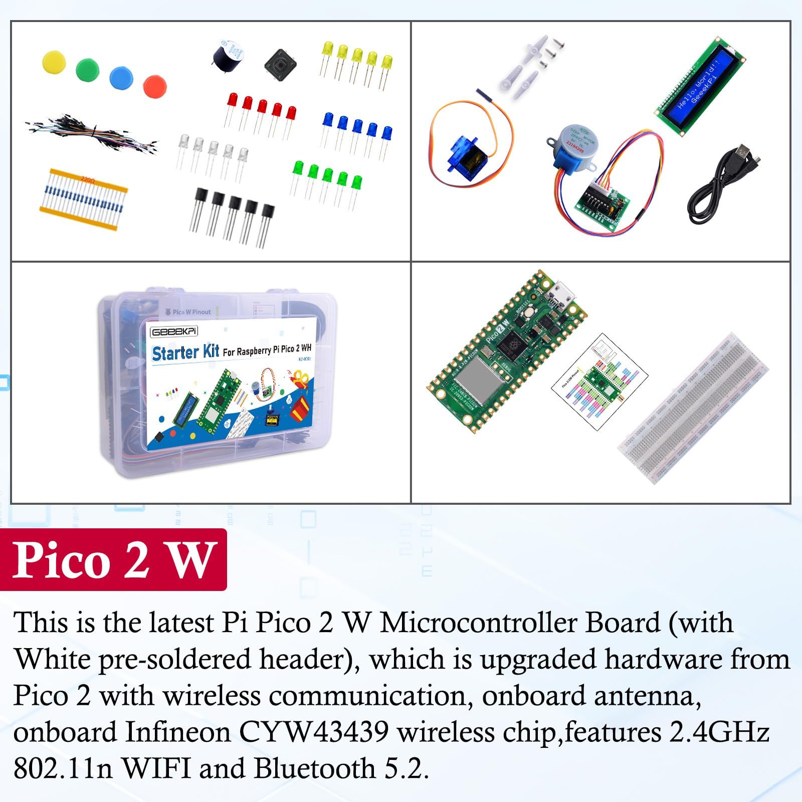 GeeekPi スターターキット Raspberry Pi Pico 2 W 付属 デュアル Arm Cortex M 33 およびデュアル Hazard 3 RISC V マイクロコントローラ 詳細なチュートリアル 159 個のアイテム 9 つのプロジ