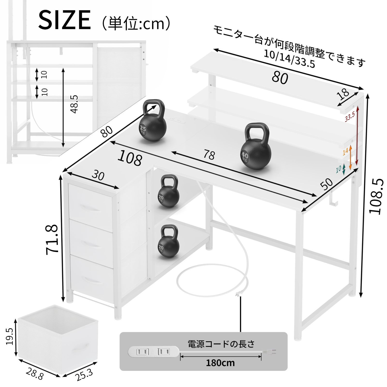 オフィスデスク ゲーミングデスク 書斎 収納たっぷり 引き出しとコンセント付き 収納ラック付き モニタ台の高さ調節 L型デスク 左右組み換え自由 ホワイトWH テレワーク 幅108奥行80高さ85 108 5 cm L型 PCパソコンデスク LunarL