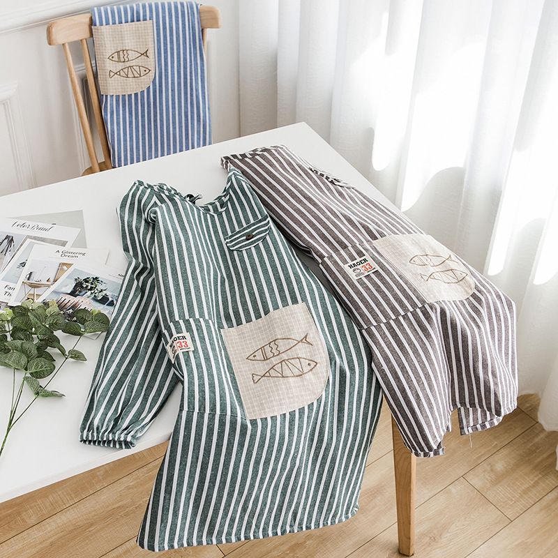 割烹着 かわいい おしゃれ かっぽう着 エプロン スモック 大人 保育士 長袖 防水 防汚 袖付き シンプル ストライプ ポケット 料理 キッチン fengxz 184