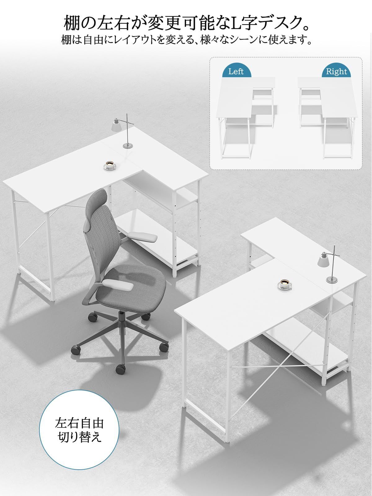 収納棚は左右どちらにも付け替え可能:L字デスクは、収納棚を左右どちらにも取付が可能です。お部屋のレイアウトや利き手に合わせて置きたい場所に置けます。パソコンデスクはコーナーにもお部屋の中心にもフィットします。空間を活かせるデザインでベストな作業環境が整います。書斎机、子供の学習机、作業机としても適当です。