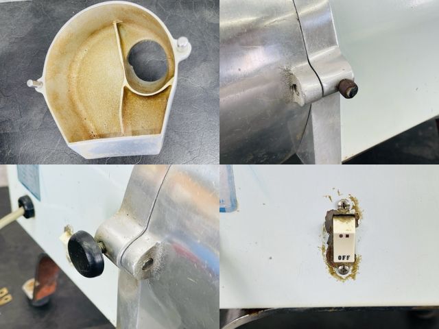 側面全体に傷サビ跡あり、正面上変色したシール、蓋内側全体に黄ばみ、脚サビ傷汚れなどがあります。脚ゴムにひび割れがあり、側面のネジの黒い部分が片方ありません。