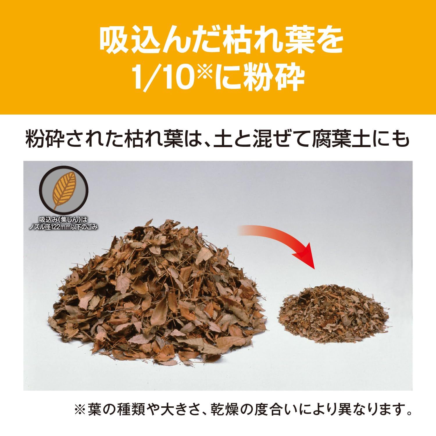 ●吸込んだ落葉は約1/10に粉砕します