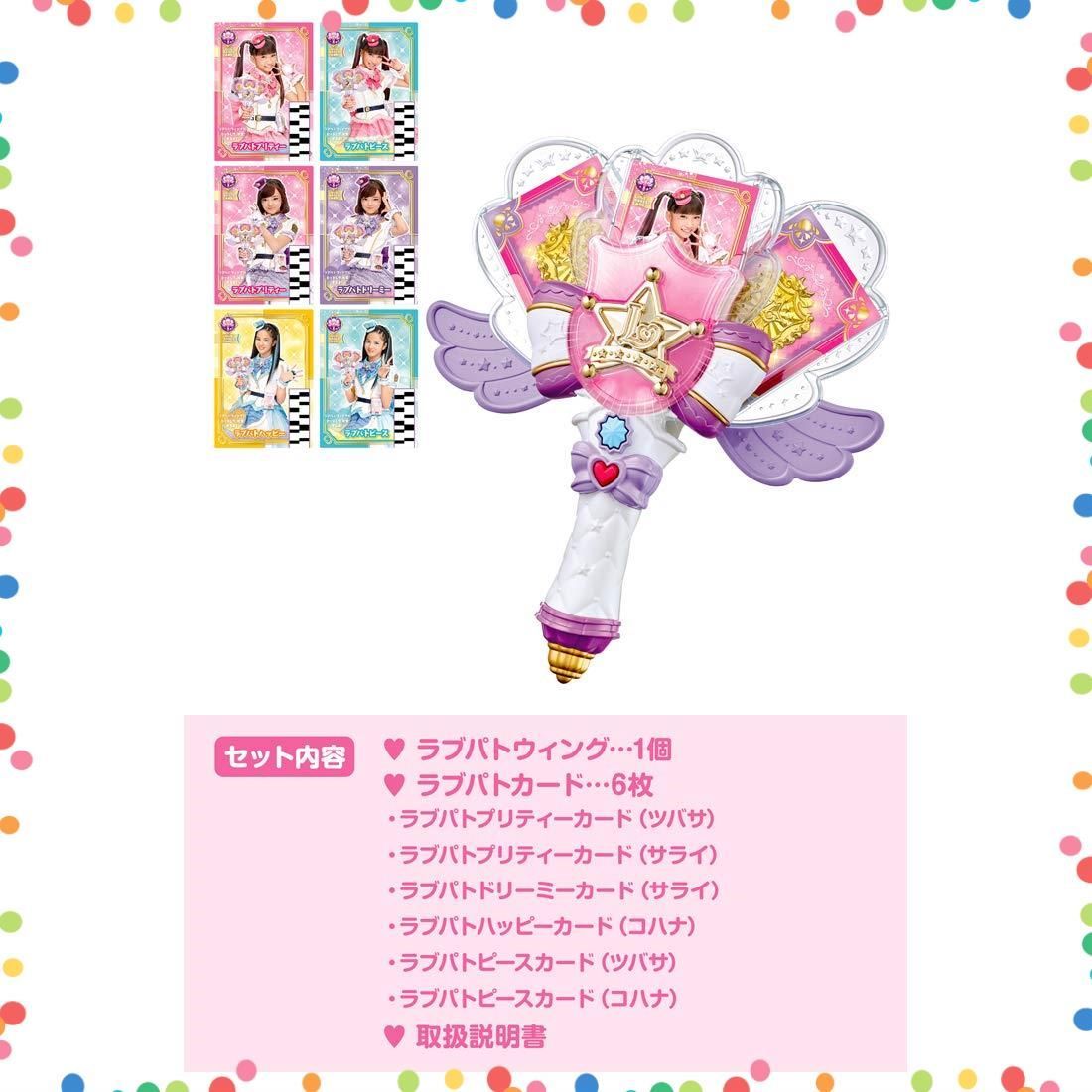 【セット内容】ラブパトウィング(1)ラブパトプリティーカード(ツバサ)(1)ラブパトプリティーカード(サライ)(1)ラブパトドリーミーカード(サライ)(1)ラブパトハッピーカード(コハナ)(1)ラブパトピースカード(ツバサ)(1)ラブパトピースカード(コハナ)(1)取説(1)