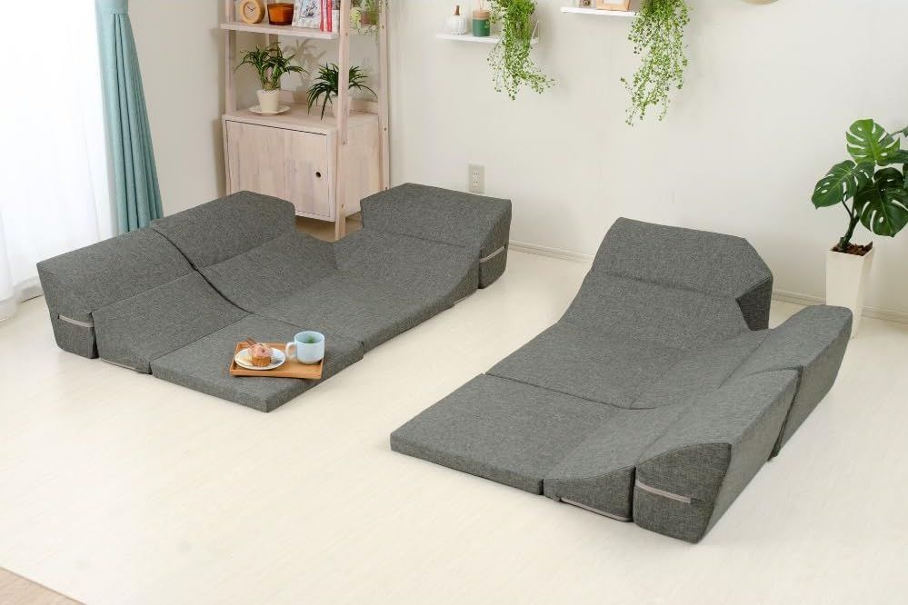 4つのパーツに分かれており、自由なレイアウトが可能です。コーナーソファも背もたれが倒れる仕様で使い方の幅も広がります。シンプルなデザインは和室・洋室どちらにも馴染み、ノンフレーム&軽量設計で掃除や模様替えもラクラクです。