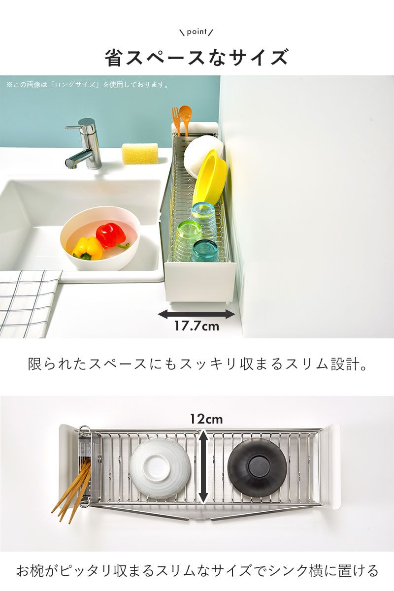 シンク横の限られたスペースに収まるスリムな水切りラック。底面には特許出願中の波型ワイヤー「たてよこウェーブ」を搭載し、食器を縦・横どちら向きでもしっかりキャッチ。食器の安定感が増し、出し入れもスムーズです。1~2人分の食器を収納できるコンパクトサイズで、食洗機を使うほどではない少量の洗い物に最適。自動で水が流れる専用トレー付きで排水の手間を省き、トレーは取り外して丸洗いできるので清潔に保てます。さらに脚部は高さ調節機能付きで、段差のある場所でも設置可能。滑り止め付きで安定感も抜群です。