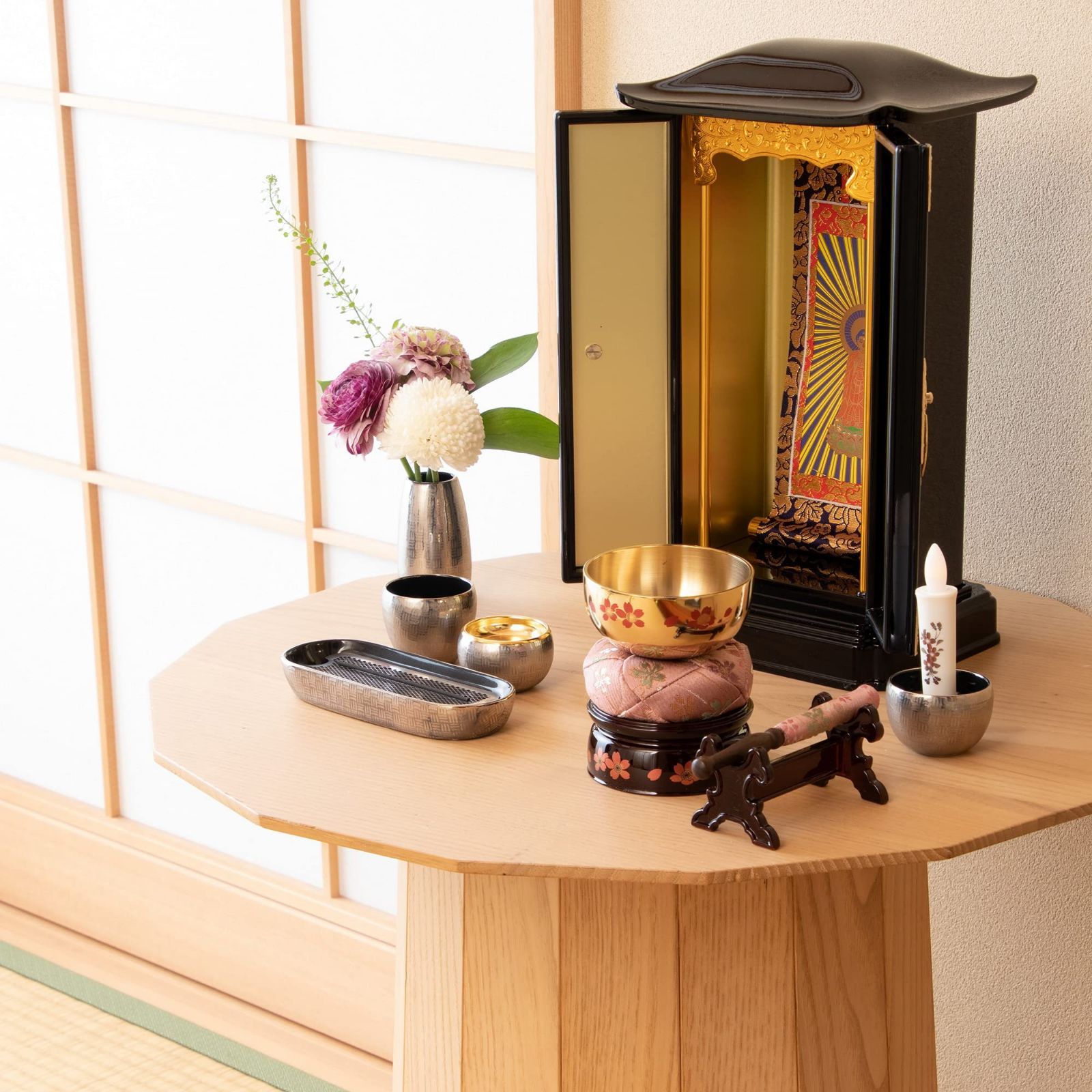 リビングボードなど、小さなスペースにも置きやすいおりんです。お写真のみを飾ったお仏壇スペースや、ステージ仏壇などにもお使いいただけます。
