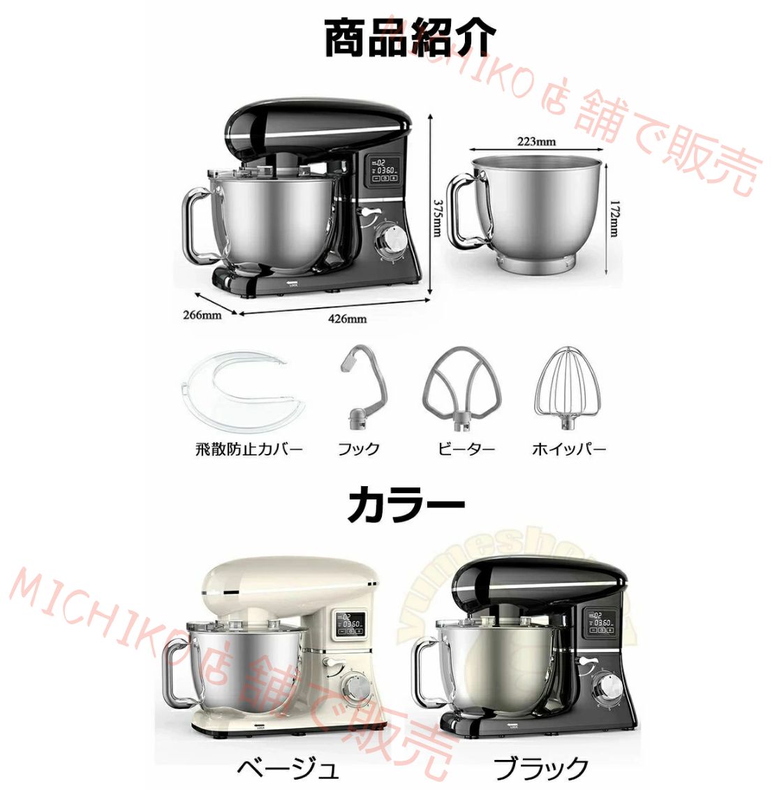 ビーター、ドゥフック、ホイッパーの3種類のアタッチメントが付属し、混合、撹拌、泡立てなどの機能を簡単に実現できます。