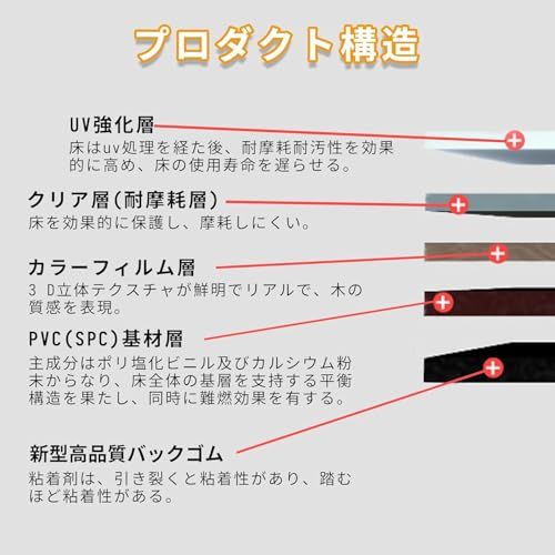 【粘着タイプ フロリングシート】床タイルの表面は防水加工されており、水が付いても浸透しない。バックゴムは帯状の設計で、粘着力が強く、裏面のゴム材料が均一で、施工がより簡単である。重い家具を置いてもタイルがずれない。背景ゴムの保護フィルムは、環境に配慮した透明な接着材で作られ、より軽量になっています。