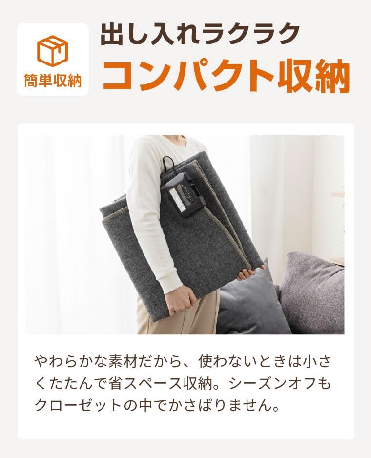 コンパクトに折り畳みができる電気カーペットです。あたたかくなった時など使用しなくなった場合、限られた収納場所でも収納可能です。