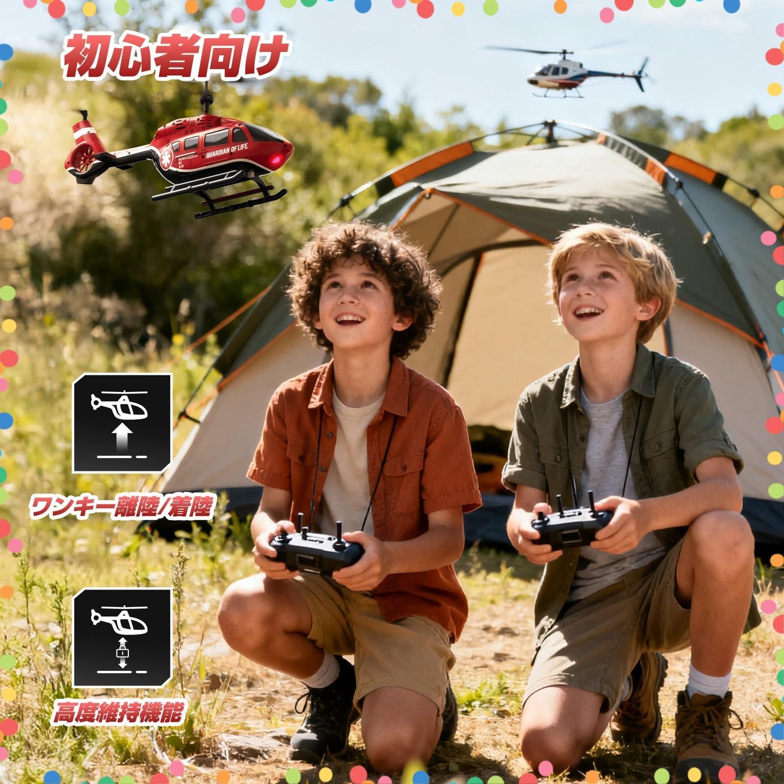 【没入感のあるレスキューコンセプト & LED灯】 緊急事態を想定したカッコいいデザインが、お子様の想像力をかき立てます。発光するLEDライトがナイトフライトを演出し、昼も夜も熱中できるラジコン子供向けの大ヒット作です。3.5CHの機動性で前後左右自由自在。