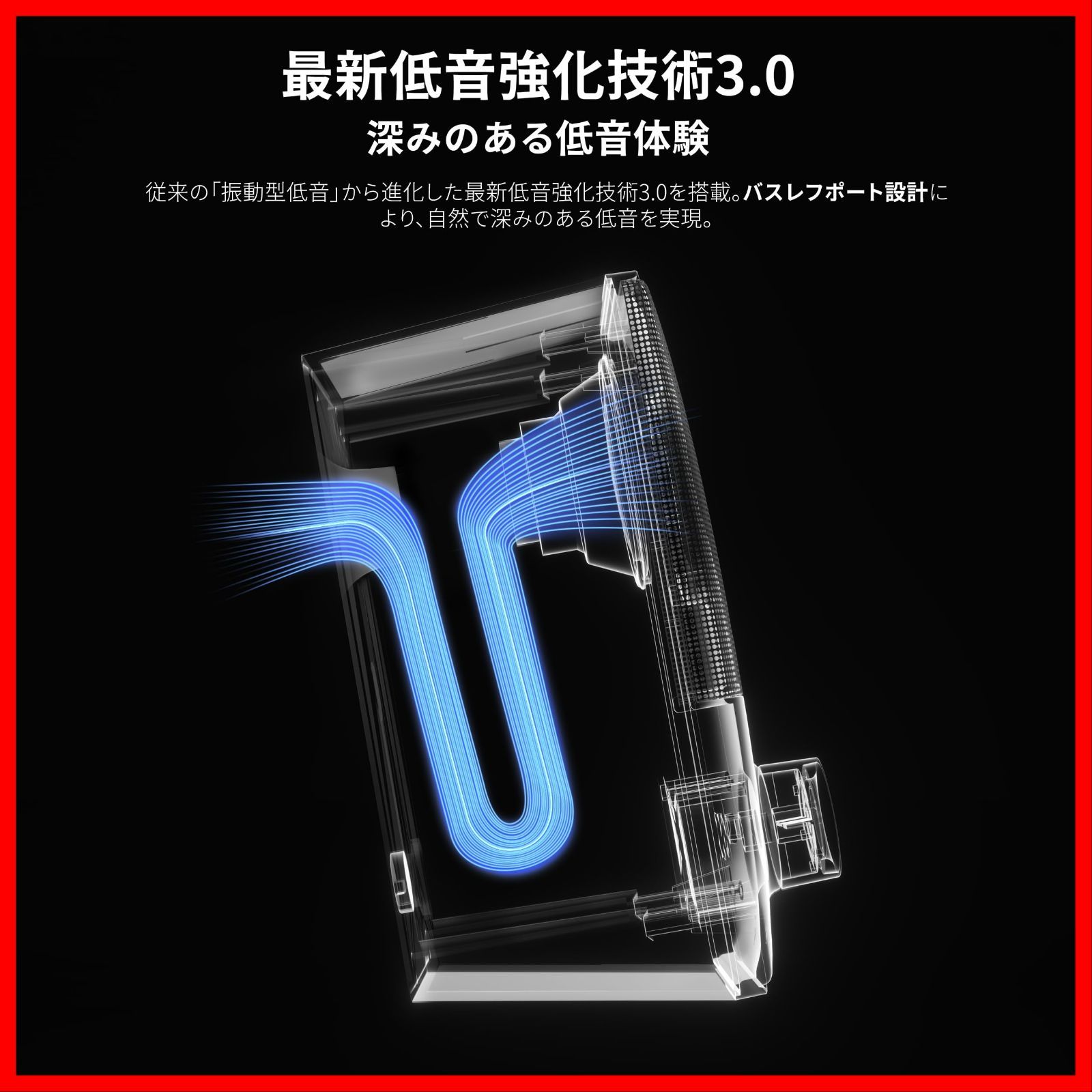 【最新バスレフ低音強化技術&深みのある低音体験】独自設計の曲線インバーターチューブ型バスレフポートが風雑音を効果的に抑え、深く沈み込む低域と力強い迫力を実現。従来の密閉型構造に比べて、低域の伸びと明瞭感がさらに向上。量感豊かな低音と高い解像度を両立し、“こもり感”のないシャープな音質をお楽しみいただけます。