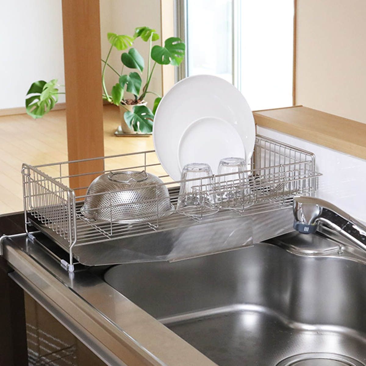 ●シンクサイドのわずかなスペースを利用して使える伸縮式の水切りラックです。