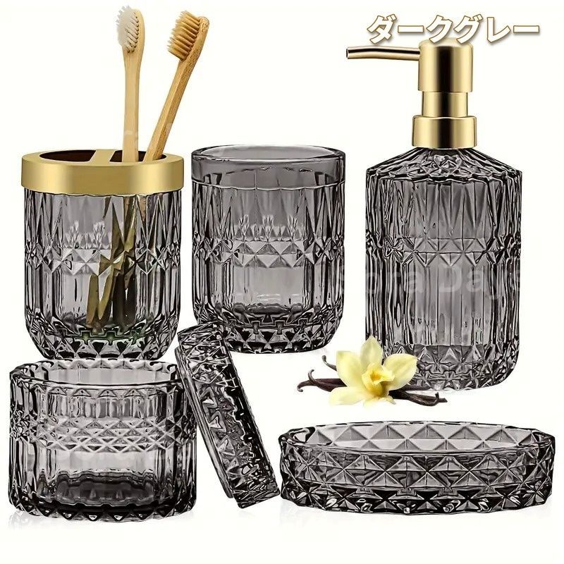 輝く洗面台の主役、エレガントなガラスの洗面用具5点セット。