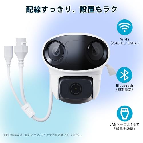 【ワイヤレス&有線接続】このカメラは、Wi-Fiを利用したワイヤレス接続だけでなく、付属のネットワーク信号ケーブルを使用した有線接続も可能です。ネットワーク接続が不安定な場合は、有線ネットワークを使用してカメラを直接ご家庭のネットワークに接続することができます。本製品はPoEに対応しており、LANケーブル1本で電源供給と通信が可能です。