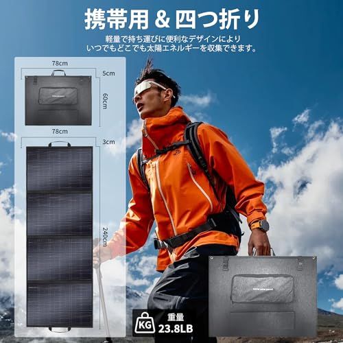 【軽量、折りたたみ可能、コンパクト】折りたたみ部分はバッテリーの破裂を効果的に防ぎ、長期間の使用を保証します。ソーラーパネルの背面には自立ブラケットがあり、4590に調整でき、使いやすいです。収納サイズは78.5 x 60 x 7.5 CM、重量はわずか12.5 kgで、持ち運びに便利で、すっきり収納できます。キャンプ、ハイキング、釣り、車中泊などのアウトドア活動だけでなく、地震などの緊急時にも大活躍します。