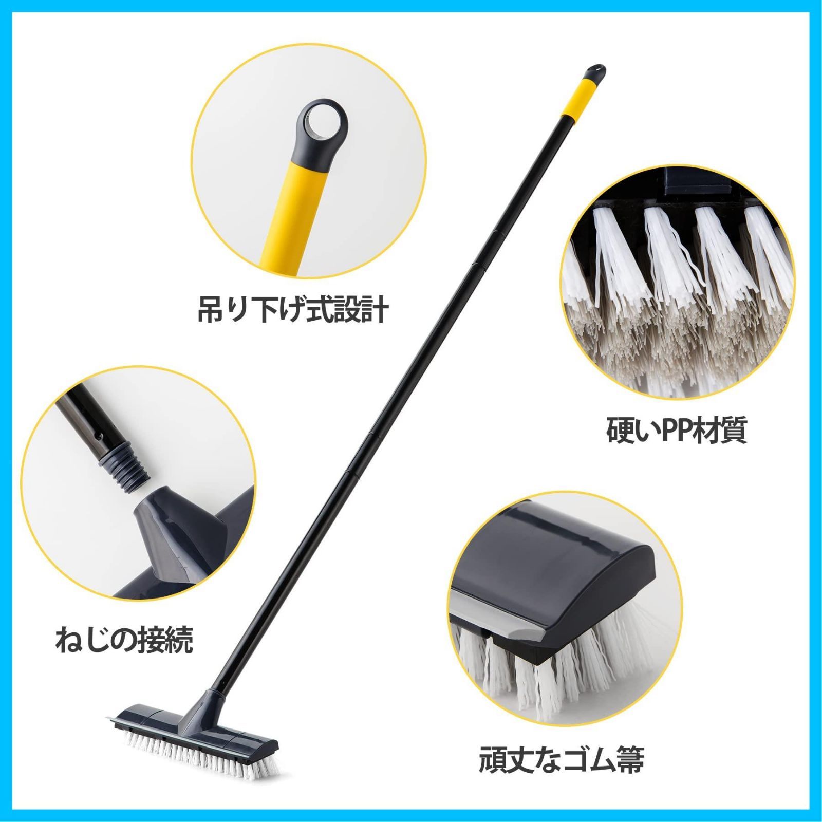 【清掃能力は強い】ブラシは乾いても濡れても使用できます。壁、キッチン、バスルームに使用されるだけでなく、ガレージ、歩道、スタジアムなどにも最適です。 【水に強いPP素材の硬いブラシ】毛先を広げた形状だからコーナー部分もしっかり洗えます。異なる太さの毛のダブル植毛なので、浴室の床の細かい溝にも入り込み、汚れを掻き出します。