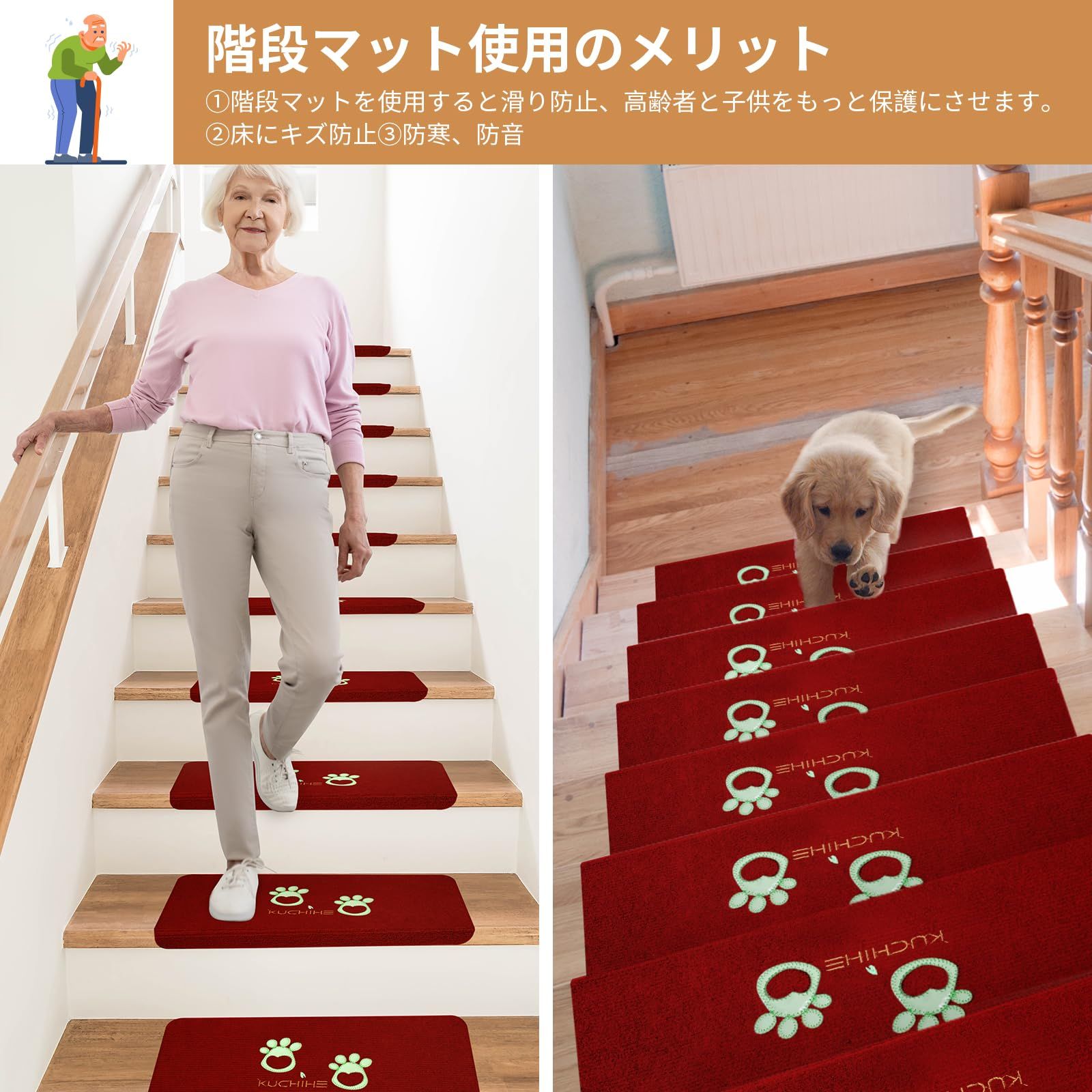 KUCHIHE 階段マット 階段 滑り止めマット 犬 猫 階段滑り止めマット 蛍光 滑り止め 折り曲げ 防音 洗える キズ防止 蛍光 約55x22cm 15枚セット おしゃれ 吸着 騒音対策 厚さ4.5mm (55X22(cm) red)