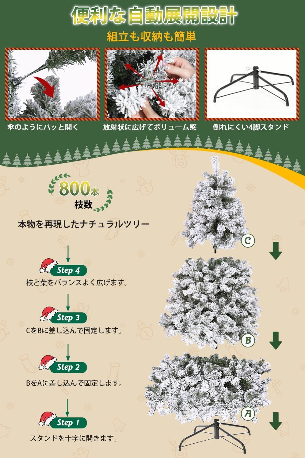 クリスマスツリー180cm 雪化粧 豪華800枝数 15m-LED電飾付き Christmas tree 高濃密度 白 ツリー オーナメントセット 自動展開式 北欧風 飾り付き クリスマスボール・リボン・造花付き 屋内・屋外用クリスマスグッズ 店舗装飾