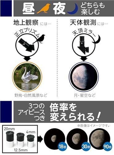 【3つのアイピースで倍率チェンジ】見たい対象物に合わせてアイピースで倍率の調整が可能。[それぞれの倍率] 4mm: 90倍 / 12.5mm: 28.8倍 / 20mm: 18倍