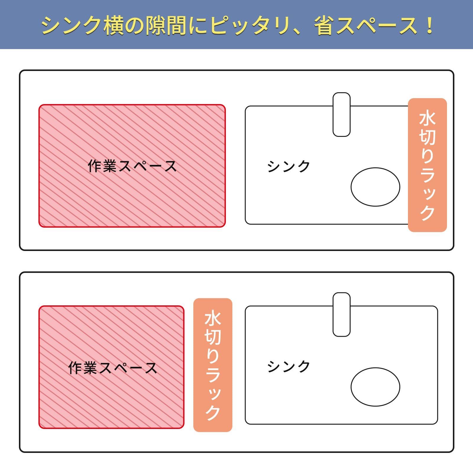 【洗い物を置きっぱなしで乾かせる】お皿が立ちやすい設計、風通しがよいため、洗った食器を置きっぱなしで乾きも早いし水切れも抜群!食器はもちろん、フライパンなどの調理用品もスッキリと収まる。洗った食材の一時置き、料理の作業スペース、食器の水切りやふきんの一時置きにと大活躍。