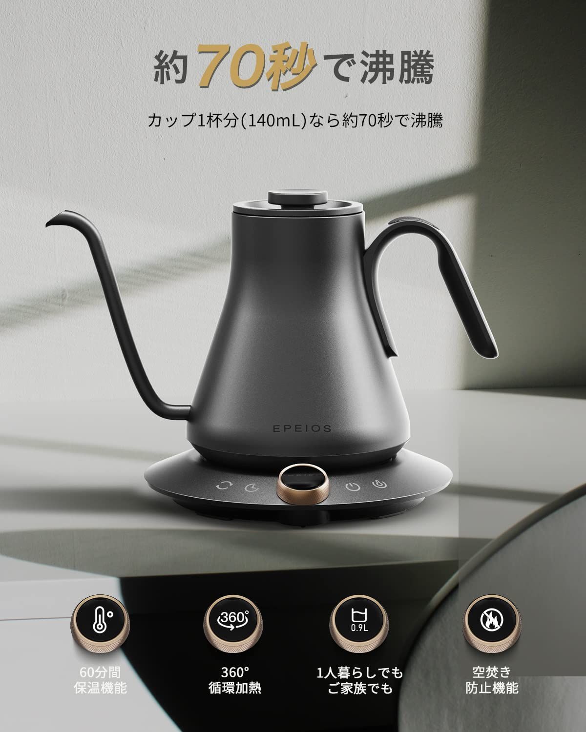 【大切な人と一緒にドリップコーヒーを味わいましょう】 Epeiosドリップケトルは容量が0.9Lで、1~4人暮らしに最適、電気ポットとしても使いやすいです。シンプルなデザインはお部屋のインテリアにも馴染み、誕生日プレゼントや引越し、結婚記念日、クリスマスなどのイベントにギフトとしてもぴったりです。