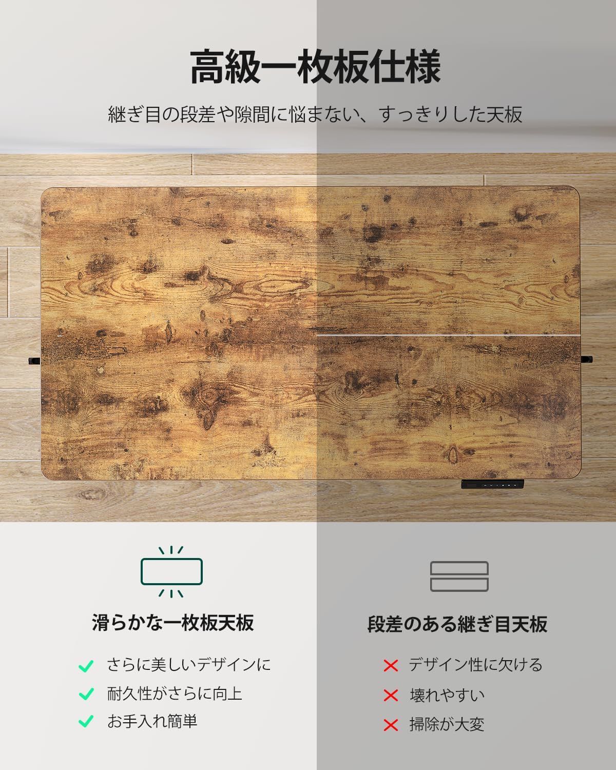 【継ぎ目のない一枚天板で、見た目もお手入れもすっきり】FEZIBO昇降デスクは高品質な一枚天板を採用しているため、隙間や段差が一切なく、見た目の美しさと清潔さを保てます。お手入れが簡単なのはもちろん、一体成型ならではの高い安定性で、快適な作業環境を提供します。
