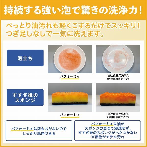 驚きの洗浄力と泡の持続力で、べっとり油汚れも軽くこするだけでスッキリ落とします。油を瞬時に分解し、しかも泡の持続力が抜群なので、ギトギト油汚れもつぎ足しなしで一気に洗えます。エア入りの持ち手がついたパウチ仕様は持ちやすく、つぎ足しの作業もラクにできます。ご使用後、容器をつぶす手間がなく、ゴミ廃棄量も削減できます。無香料。超コンパクト・原液タイプ。