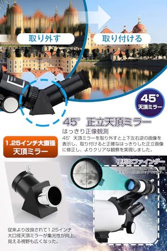 【466x高倍率&はっきり観測】天文学初心者向けの天体望遠鏡には、3種類の高品質接眼レンズ(K6mm、K10mm、K25mm)を用意し、天体の低倍率および高倍率のビューを提供し、月面や木星の衛星、星雲星団の観察に適しています。7Xバローレンズも付属し、接眼レンズと合わせて、16466倍の高倍率を実現しました。45の天頂ミラーを搭載し、望遠鏡は正確で高解像度の画像を提供します。月の全体から詳しい表面まではっきりと見え、陸上の観測や天体観測にピッタリ!