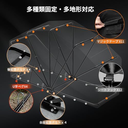 【頑丈なフレーム・多種類固定】オートバイ専用に設計されたバイクガレージ、フレームはすべて直径22mm、壁厚0.8mmの亜鉛メッキ鋼管で構成されており、頑丈で長持ちします。ベースプレートは厚みを強化し、通常モデルに比べて7本のパイプを採用することで、支持力がさらに向上しました。多種類の固定方法が組み合わされています。U型の地釘が底部の鋼管を包み込んで地下に挿入され、フックとマジックテープで、タープとフレームをしっかり固定します。コンクリート地面用に、拡張ボルトを特別に用意しています。強風の日にも愛車を保護します。
