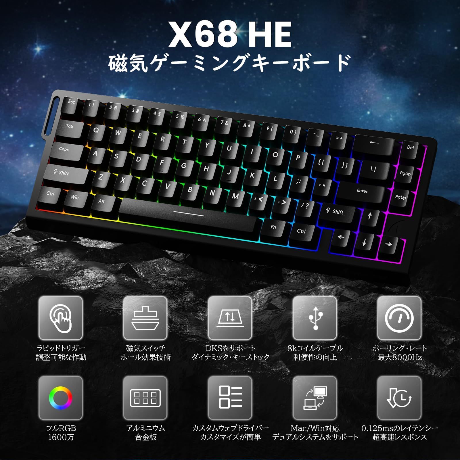 SHARKx ATTACK X 68 HEゲーミングキーボード ラピッドトリガー対応 磁気スイッチ 8000 Hzポーリングレート 0 125 msレイテンシー 01 mmRT精度 0デッドゾーン snap tap 128 Kスキャン