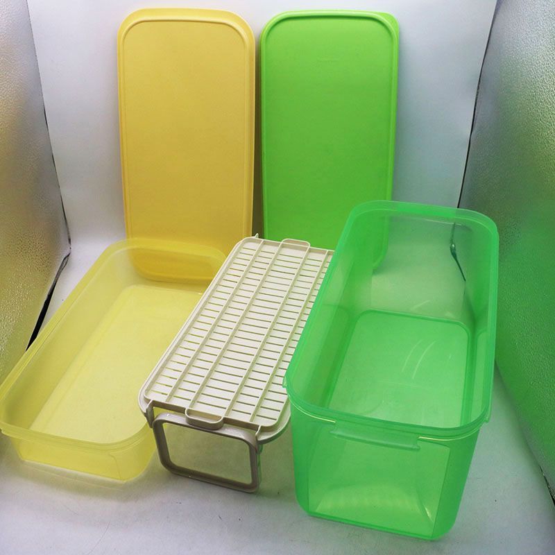 ・タッパーウエア ロングハンドリアン2段セット ベルト欠品(新品良品、チリの付着や薄い汚れが有ります。セット内容:3.5L×1・蓋(黄)、寸法:約縦:18cm・横:37cm縦・高さ8cm・9.0L・蓋(緑)、寸法:約縦:18cm・横:37cm縦・高さ17cm)