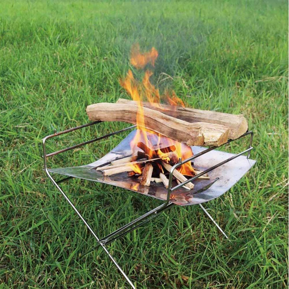 軽量でコンパクトになる焚き火台。2つの脚を組み合わせ受板をはめるだけの簡単組み立て。焼網も付属しており4人ぐらいのバーベキューでも使用可能。受板は一枚のステンレス板で灰処理や掃除が楽にできます。湾曲したところを空気が通り燃焼を助けます。
