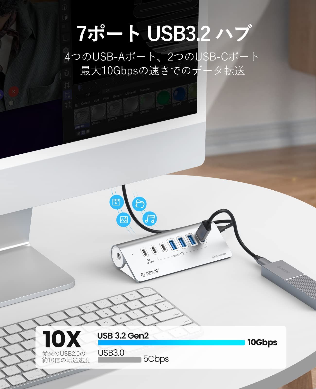 ORICO USB ハブ USB3.0 7ポート 60WPD充電 10Gbps高速転送 アダプタ付き セルフパワー/バスパワー両対応 100cmケーブル USB-C/USB-Aデバイス両対応 Windows/Linux/Mac OS/Android等OS PC/タブレット対応 テレワーク リモート 在宅勤務
