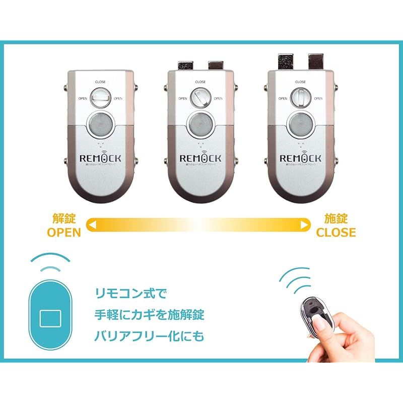 「鍵穴のないリモコンドアロックREMOCK」 ー安全は自分自身で守る時代です。-特徴■ 鍵穴がないリモコン式で、外側から取付け位置が全く予想できないためピッキングはもちろんサムターン廻しによる侵入犯罪からも100%身を守ります。■ 多くのご家庭に使われている単純な「ディスクシリンダー」タイプの玄関錠でも「REMOCK」があれば他人による侵入を完全に防げます。■ 鍵穴のないリモコン式だから熟練のカギ屋さんでも開閉不可能。完全なあなただけのプライベートルームが作れます。■最近多発しているキーに刻印されたキーナンバーのスキミングによる複製被害からもREMOCKなら無縁です。本体■ 特殊粘着シートを採用。ビス1本も使わず、わずらわしい取付け工事は一切不要。工事業者さんを呼ぶ必要もなくご自身で簡単に取付けができます。■ ドアを傷付けないから一般住宅はもちろん、賃貸マンションや事務所、店舗にも最適です。■ お引越しの際は取り外して移設も可能です。リモコン■ リモコン式だから小さいお子様や足の不自由なお年寄りの方まで、リビングから楽にドアの開閉ができます。■ とてもコンパクトな設計で、いつもの金属製のカギのように携帯にも非常に便利です。■ 2億6,000万通りの個別電波コードを採用しており、複製は不可能です。■ 万が一紛失した場合でも、すぐにご自身で登録を抹消でき安心です。■ 最大16個まで追加でき、大家族や多くの方がご使用される企業でも便利に使えます。安心設計■ 電池残量が少なくなるとランプが点滅し、施・解錠音が変わり、自ら交換時期をお知らせ。■ 電池交換をしなければ解錠はできても施錠ができなくなる安心設計。■ 「開けるとき」と「閉めるとき」を音で区別するので、閉め忘れを防止します。幅広い用途■ 事務所や店舗に幅広く設置でき、セキュリティ経費も大幅削減。もちろん自動ドアにも取付け可能です。■ 入居前にカギを交換しても、いまいち安心できない賃貸マンション。でも「REMOCK」なら絶対に誰も入れません。■ ここ最近急激に増えている勝手口からの空き巣対策にもバッチリ。REMOCKプレミアムサポート■万が一の故障でドアが開かなくなった場合にも24時間265日プレミアムサポートコールセンターが対応します。■緊急鍵開けサービスやドアの修理・復旧に掛かった費用を10万円までサポート。さらに近隣の方への謝礼品購入も補償します。