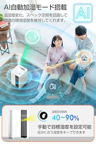 【AI加湿モード搭載・いつでも最適な湿度を維持】目標湿度設定機能はそのまま、さらに便利なAI加湿モードを搭載しており、自動で環境湿度、温度、スペックを検知して適切なパワーで加湿してくれますので、快適な湿度を維持できるうえ、電気代を抑えることもできます。ミスト量は3段階で調節可能で、ヒーターON/OFFと組み合わせして6段階のミスト量調節が可能、用途や好みに合わせて調節できます。