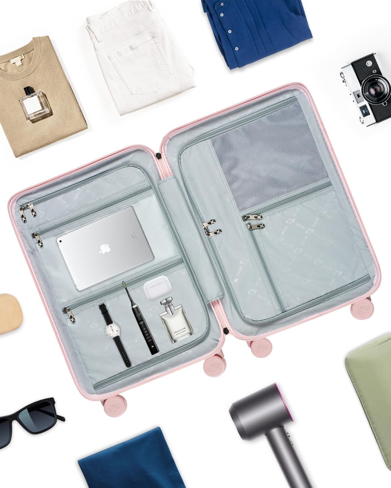 [MGOB] スーツケース ドイツ製ポリカボネート使用 超軽量 耐衝撃 静音 360度回転キャスター・TSAロック搭載 キャリーケース PC Sサイズ 機内持ち込み ワイドバーデザイン スーツケース 頑丈 旅行 ビジネス 出張 USB Type-C ポート付き YKKファスナー (ピンク 20サイズ 3泊4日 45L)