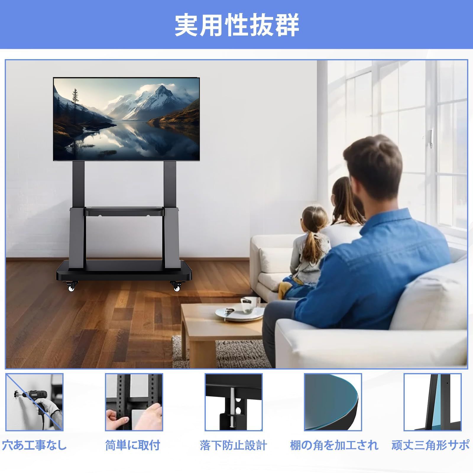 【業務・家庭両用】大型テレビも設置できる設計になっていますので、自宅で使用するだけではなく、会議室での大型モニター設置や受付での案内用として、また広告向けのデジタルサイネージ用など様々なシーンで使用できます。