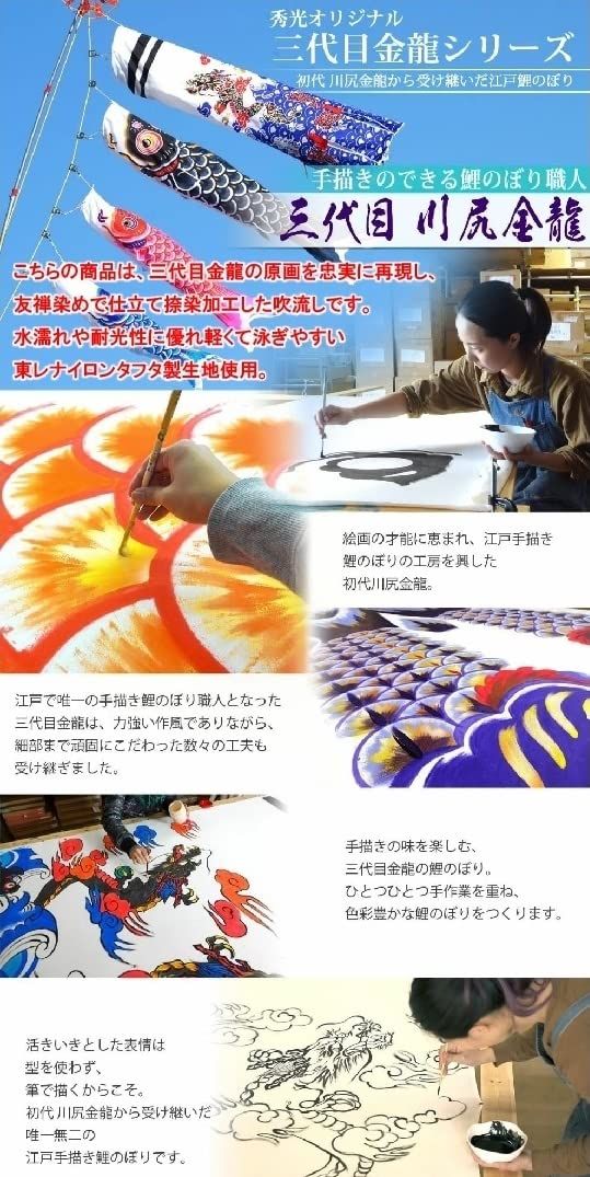 秀光人形工房オリジナル! 江戸東京で唯一軒の手描きの出来る鯉のぼり職人『三代目金龍』作の金昇龍吹流し付、鯉セットです。 設置掲揚に必要な物は全てセットされていますので、簡単に設置する事が出来ます。