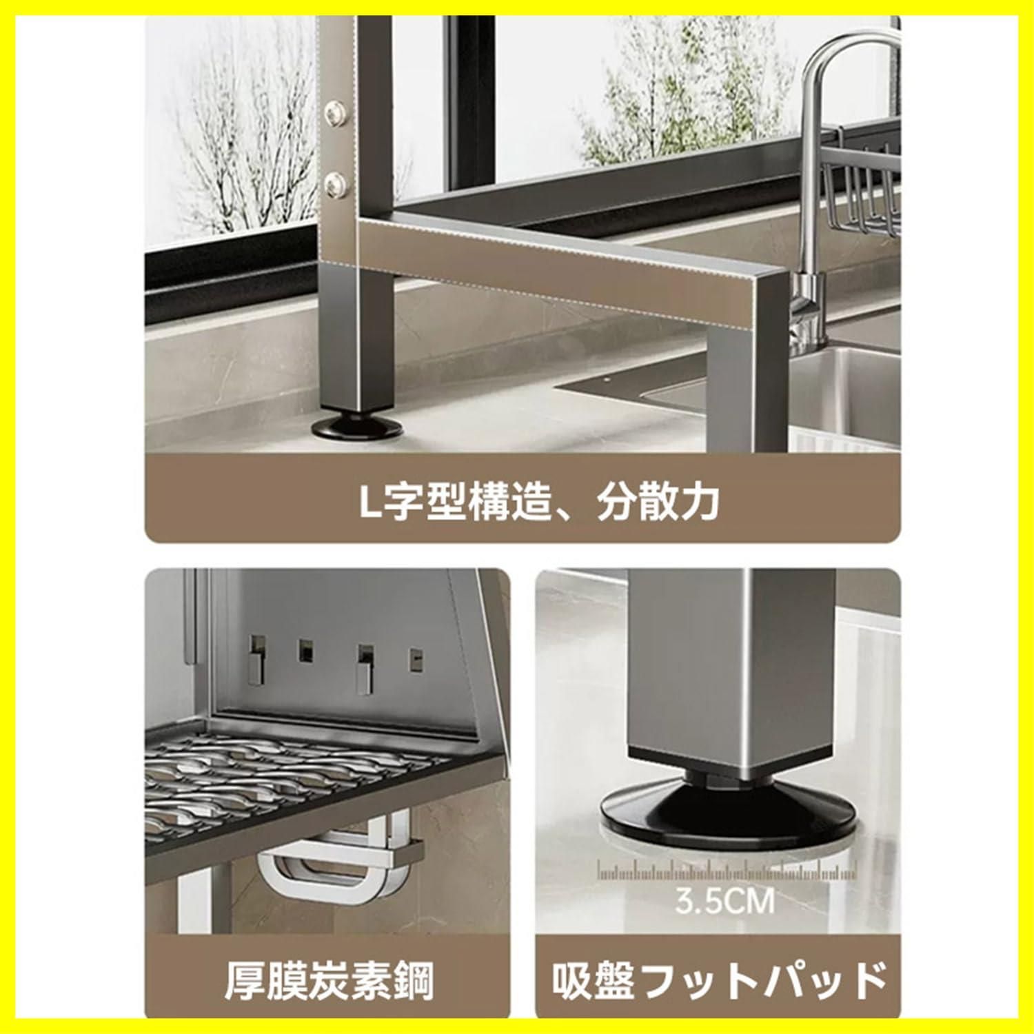 「耐食性のあるステンレス材質」キッチンラックは高品質なステンレス鋼で作られているので、健康で且つ耐食性抜群、表面には焼付け塗装をされて、錆びる心配が少なく、防水性にも優れています。水回りで使っても長時間にお使えます。