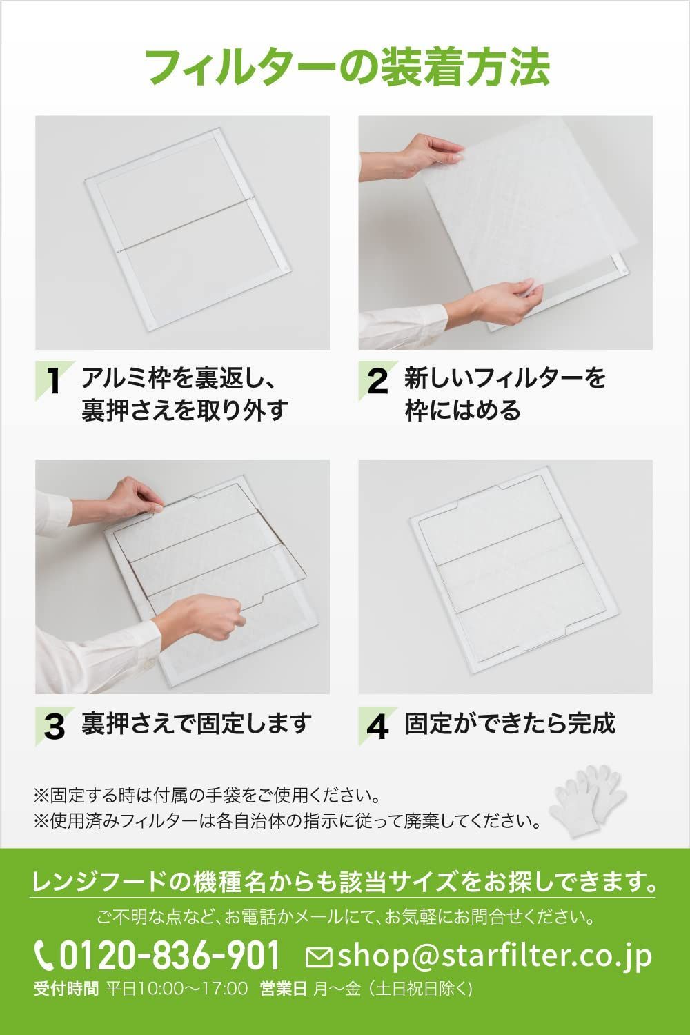 【入れ替えるだけの簡単お手入れ】多くのご家庭のレンジフードに備え付けられている金属フィルターをスターフィルターに取り替えて設置は完了です。これだけで換気扇のきれいが長持ちし、お手入れが劇的にラクに。フィルターレスタイプの場合はマグネットで取り付けられます。