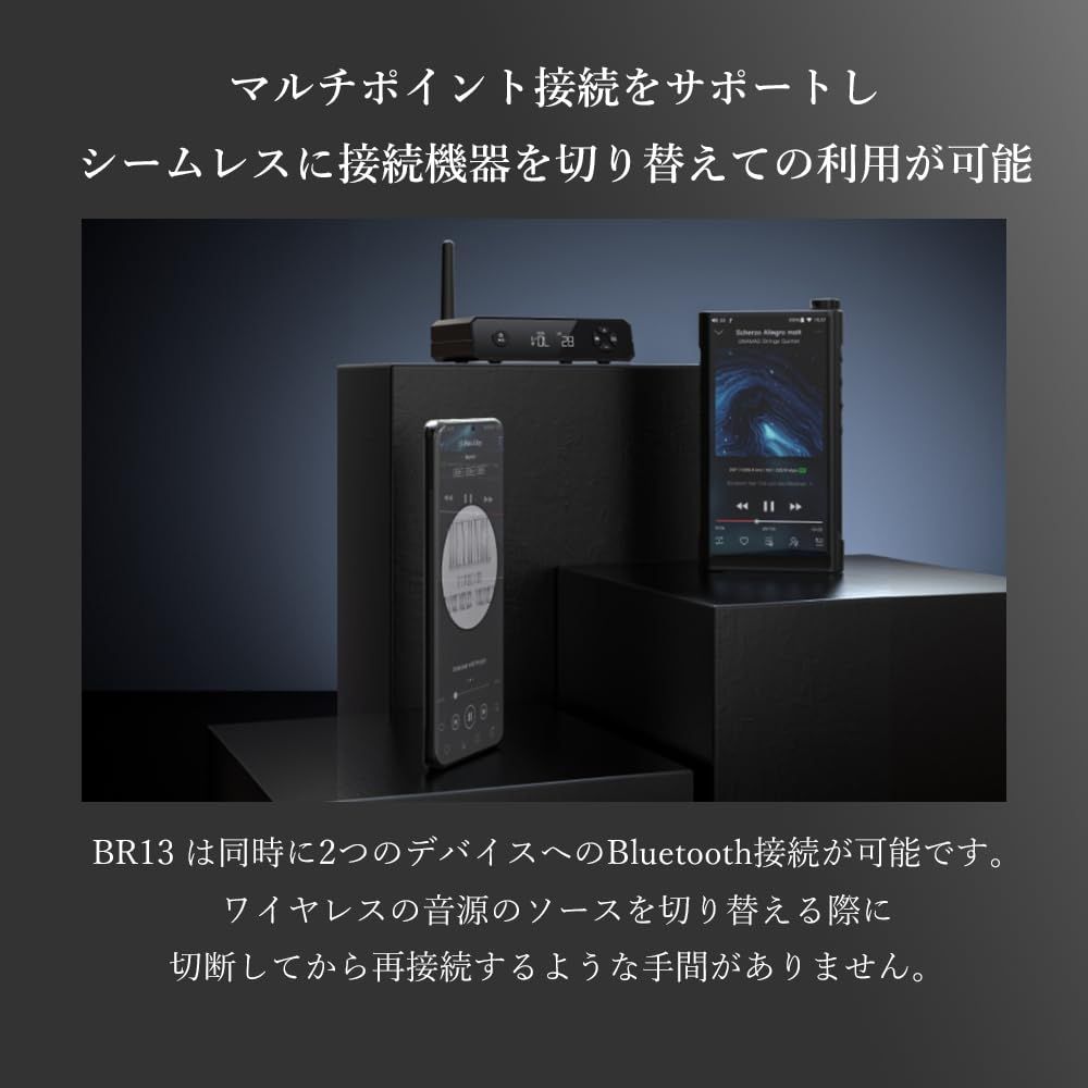 マルチポイント接続をサポートし、シームレスに接続機器を切り替えての利用が可能:BR13 は同時に2つのデバイスへのBluetooth接続が可能です。ワイヤレスの音源のソースを切り替える際などに切断してから再接続するような手間がありません。スマートフォンやタブレット、DAP、ノートパソコンなど様々な機器を接続し、切り替えて使うときに便利です。
