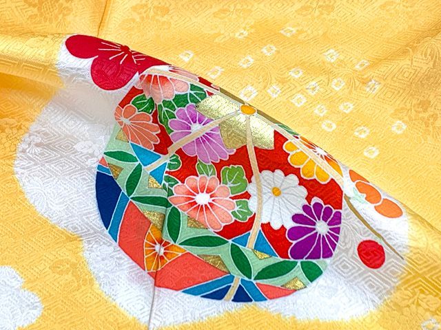 七五三 着物 3歳 正絹 フルセット 女の子 友禅 絵羽柄の着物 被布セット 白x黄色 鞠 w aWset