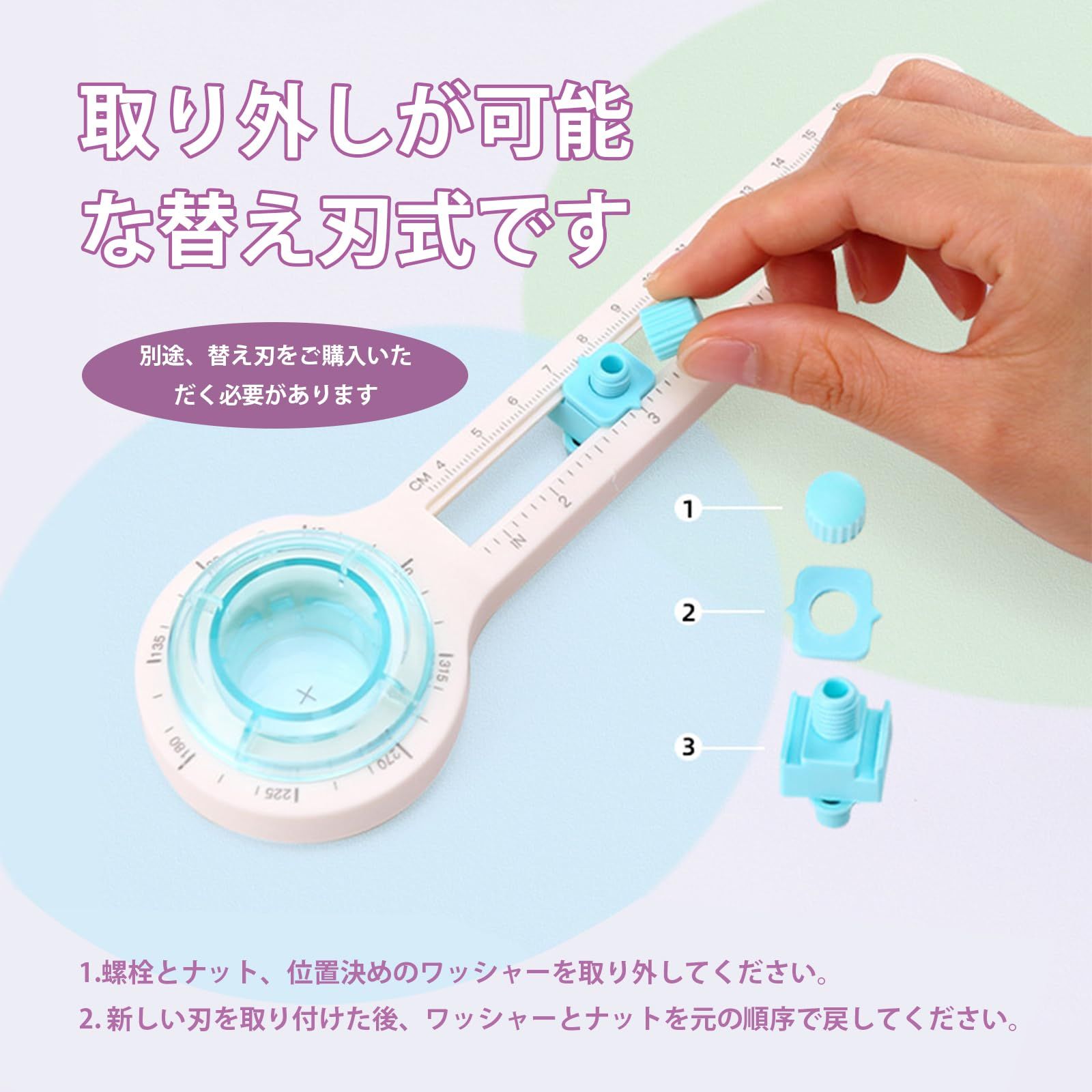 【使用範囲】直径8cmから32cmまでの完璧な円をカット出来ます。調整器を緩めてブレードを移動させることで、ご希望のサイズに調整可能です。注意:厚紙などの厚い紙はカットできません。紙以外の硬いものはブレードの鋭さに影響を及ぼす可能性があります。